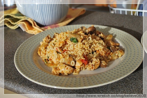 這道義大利麵先把雞肉切丁炒熟 加入洋蔥 磨菇 朝鮮薊(用其他的蔬菜代替也可以)炒到香味出來後
